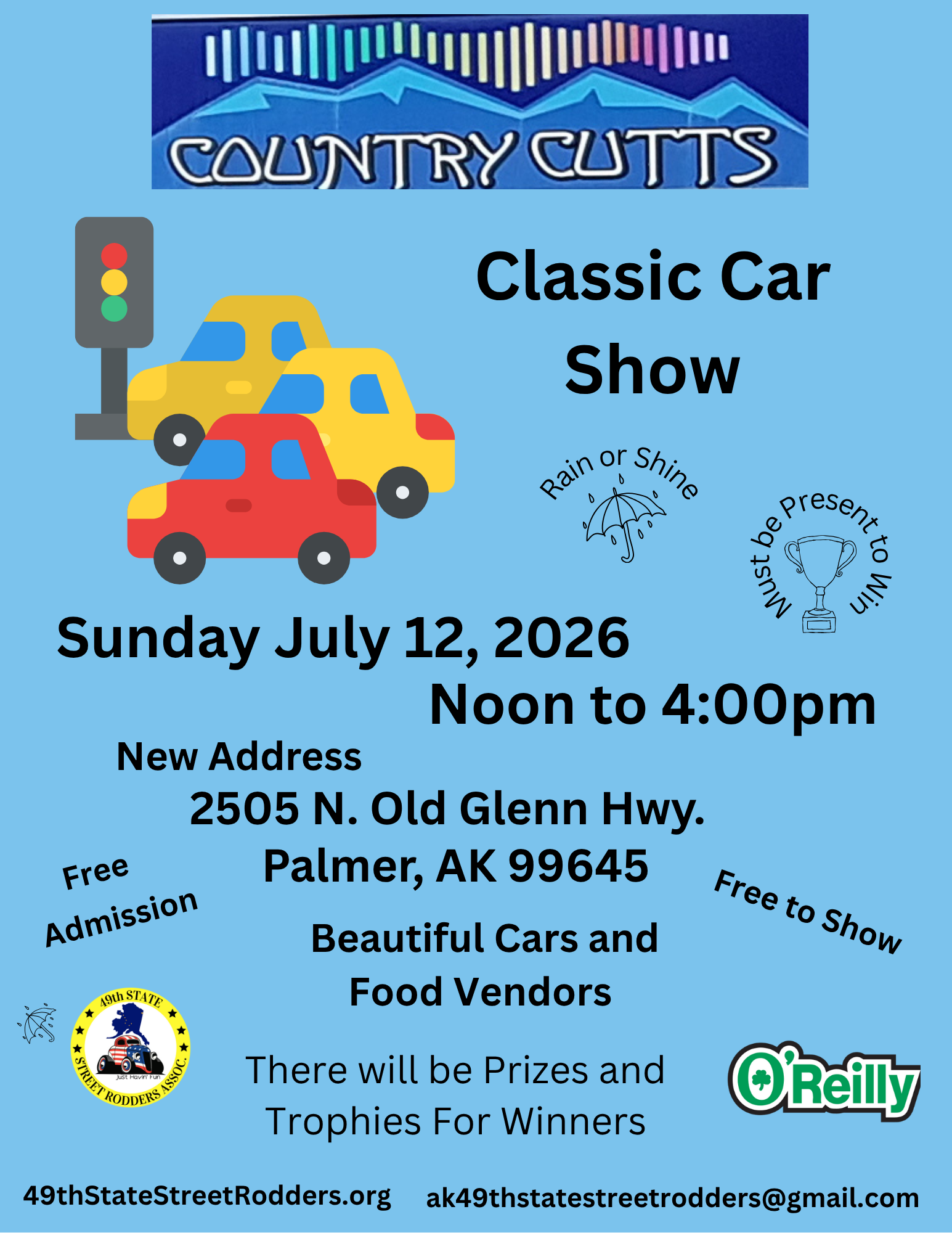 49th State Street Rodders Annual Country Cutts Car Show Sunday July 12th from Noon to 4:00pm. The new address is 2505 N. Old Glenn Hwy. Palmer. As with all our shows it is free to enter a vehicle and free to attend but you must be preset to win. As usual Stan will have trophies and give aways, but you must be present to win. So come on out we will be there rain or shine.