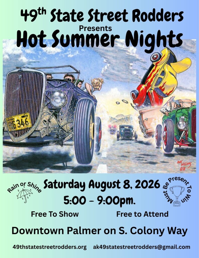 Saturday August 8th, 2026, is “Hot Summer Nights” in downtown Palmer on S. Colony Way and beyond from 5:00 to 9:00pm. Let’s hope that the weather is beautiful but as with all our shows it is “Rain or Shine” we will be there. And remember you MUST BE PRESENT TO WIN so if you have a hot vehicle don’t duck out early. I also STRONGLY suggest that you pre-register. If the weather is beautiful, we could have up to 100 vehicles, and the line gets long at check in. Just message or email me your name, the Make/Model/Year of your vehicle, and contact number and any information you want on the card for the public to know about your vehicle. If you don’t want anyone to vote on your vehicle, that’s fine, just let me know and I will not give you a vehicle tag, but you must register to show your vehicle. Here’s to a gorgeous night in downtown Palmer with the streets lined with beautiful vehicles and people enjoying themselves on a “Hot Summer Night” And Remember as with all 49th State Street Rodders events it is FREE to Show and FREE to Enter. Don’t get scammed!