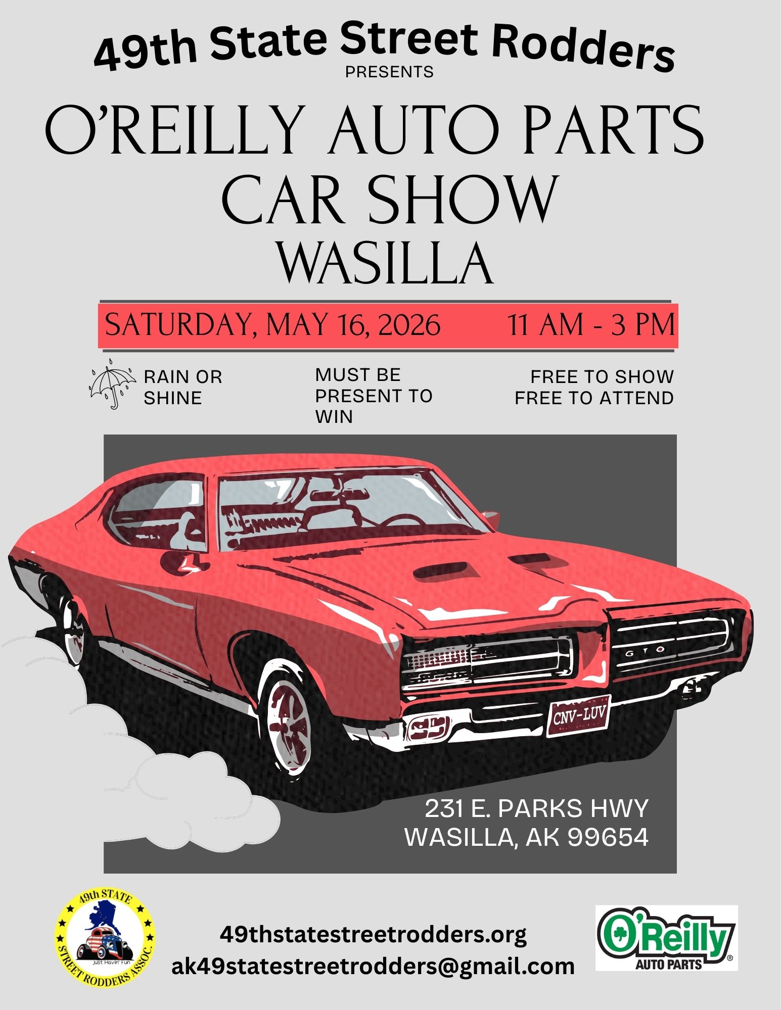 Car Show O’Reilly Auto Parts Wasilla AK Store. 11:00am to 3:00pm. 213 E. Parks Hwy Wasilla, AK 99654. This is a very popular show, and we usually have a big turnout of both those showing their vehicles and those coming to look at them. Alaska’s Best Gourmet Dog is the food truck providing their tasty dogs for the afternoon. Remember with all of our shows they are free, rain or shine, and you must be present to win.