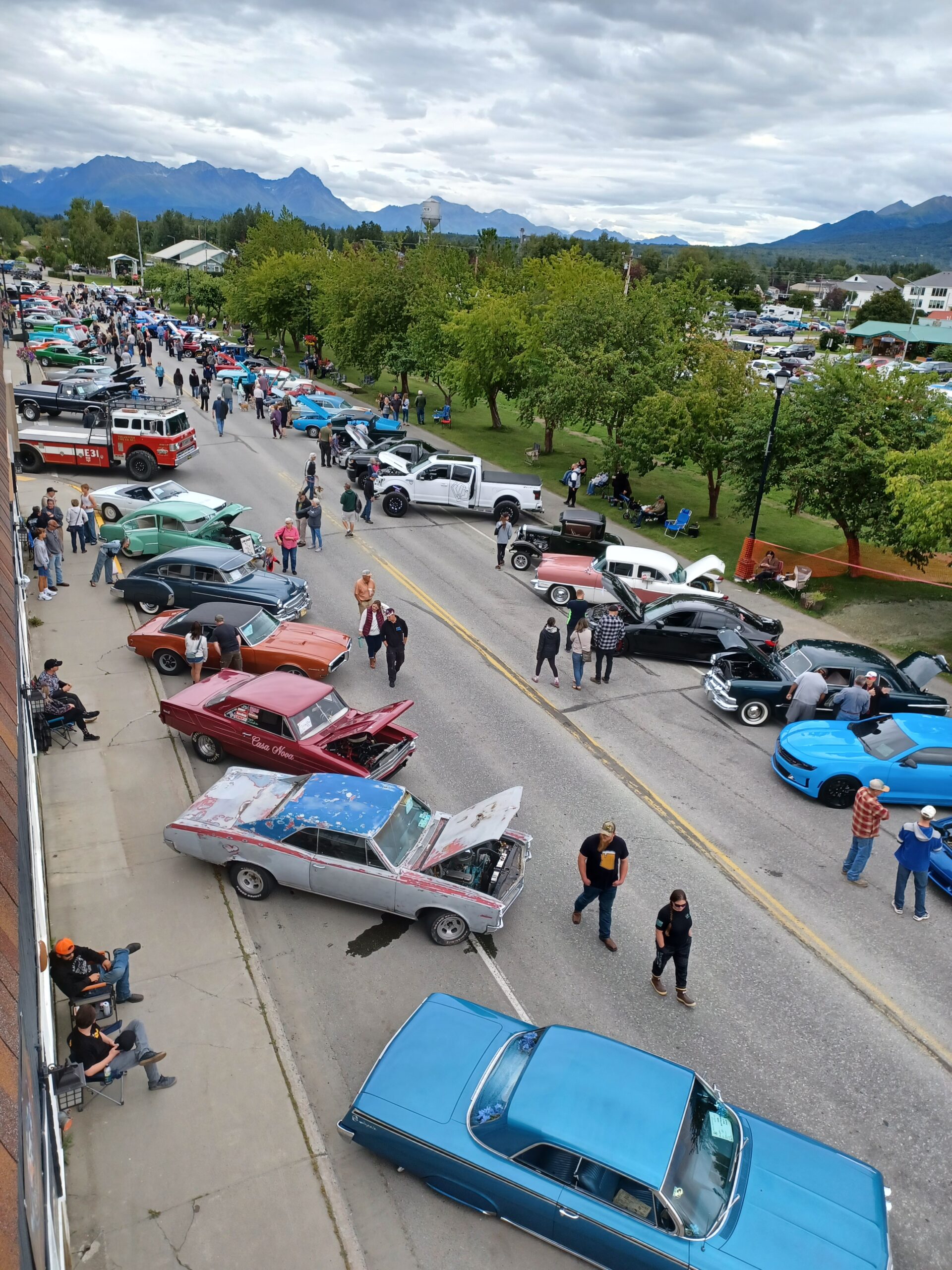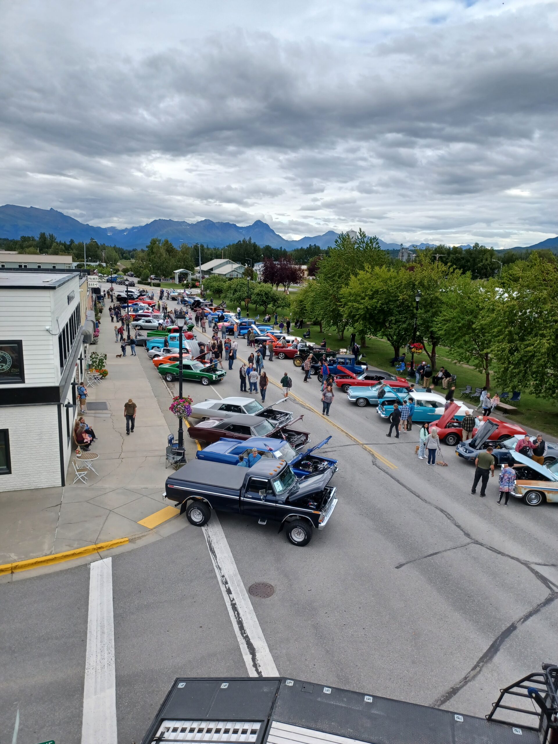 The 49th State Street Rodders Hot Summer Nights Car Show Saturday 9,2025 what a great success. Four hours of fun and beautiful vehicles. The weather stayed clear even though there was no sun it was warm enough for just a T-shirt. Towards the end of the show it sprinkled a few drops once but the downpour waited until the show was over and all the vehicles were gone from the streets. We had 116 vehicles registered. The highest number registered since the pandemic. I know we had some that showed that didn’t register because we always have some of them. I want to thank those 55 people who pre-registered. Thank you so much for helping make the line move faster. You saw the ease of stepping up to the pre-registered table and picking up you vehicle information sheet while the others waited in line. Exquisite Urban Tastes with their expanded menu was there to help feed the people as well as Downtown Palmers many fine restaurants. I want to really thank the Eagle Hotel for taking me up to the balcony so I could take some of those long street photos and the video. Thank you so very much for your kindness. Here are our winners from last night’s show. 3rd Place People’s Choice was a 1969 El Camino “Sideways”, 2nd Place People’s Choice was a 1959 Chevy Biscayne, 1st Place People’s Choice Motorcycle was a 2016 Suzuki GSYR 600, and 1st Place People’s Choice Vehicle was a 1955 Nash Metropolitan “Pinkie”. Thank you to everyone who came and everyone who entered for making it such a great show. I took over 100 pictures but can’t get them all on here. The parking lot on the other side of the trees was full also.